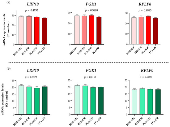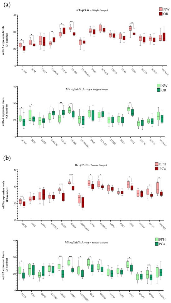 Ct value distribution of the top 3 best-ranked internal reference genes (IRGs) according to Body Mass Index (BMI) or by the presence of prostate cancer (PCa). Expression levels (Cts) were obtained by the RT-qPCR technique (a) or by the microfluidic-based qPCR array technique (b). Normo-weight—NW; Obesity—OB; Benign Prostate Hyperplasia (BPH).