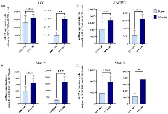 Additionally, to further validate the selection of LRP10, PGK1, and RPLP0 as suitable IRGs, we empirically determined the expression levels of two genes (ANGPT1 and LEP) that were previously described to be dysregulated in PPATs of patients with PCa and OB [24]. Specifically, Ribeiro and colleagues indicated that LEP and ANGPT1 were overexpressed in PPATs of patients with BPH under overweight/obese vs. normo-weight conditions, which was confirmed in our analyses using RT-qPCR methodology and normalizing the data with a normalization factor based on the expression levels of LRP10, PGK1, and RPLP0. Likewise, Ribeiro and colleagues demonstrated that the expression of two metalloproteases (MMP2 and MMP9) was increased in conditioned media derived from PPAT explants of overweight PCa patients as compared with normo-weight patients with BPH [25] which was also confirmed in our study after normalization of the data by IRGs (Figure 6c,d). Importantly, these changes observed in the expression levels of ANGPT1, LEP, MMP2, and MMP9 after normalization were not observed when the data were not normalized (raw data) (Figure 6a–d), which again clearly indicates the necessity of using suitable IRGs for normalization of gene expression levels in PPATs under different experimental conditions (i.e., presence or absence of Ob and PCa).