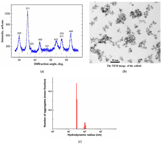 The SPION crystal structure and composition were examined by X-ray diffraction (XRD) using the DRON-3M diffractometer (Joint Stock Company “Innovation Center “Burevestnik”, Russia), providing the Cu Kα line radiation with the wavelength λ = 1.54 Å. To evaluate the size of the nanoparticle crystallinity region, precise treatment of the XRD pattern was performed, taking into account the instrumental resolution and a doublet structure of the Cu Kα line.