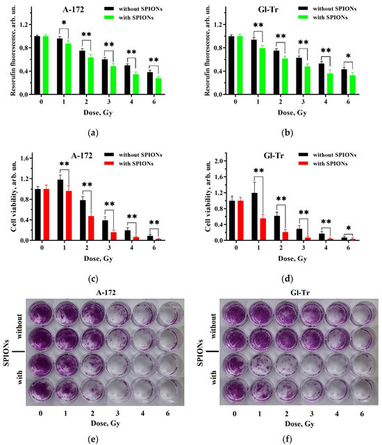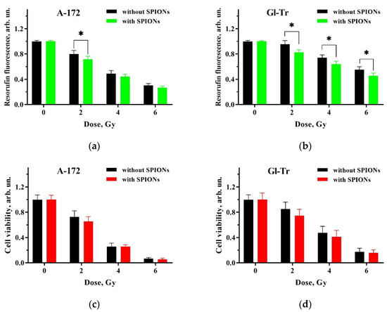 Figure 3a,b indicates, according to the Resazurin assay results, the radiosensitization effect is more pronounced in the Gl-Tr culture, suggesting a specificity of cell lines to the action of gamma irradiation in the presence of SPIONs.