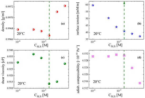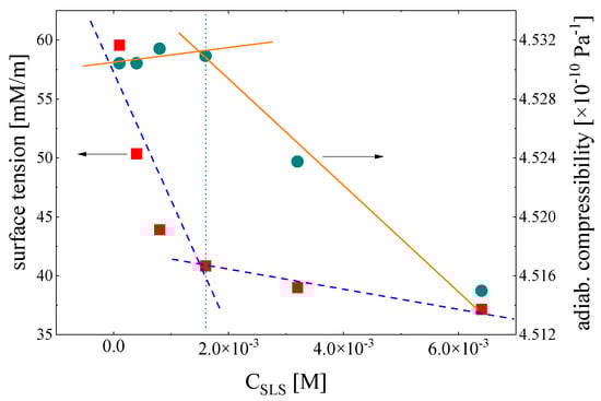 Figure 1 shows several physical properties, three of which exhibit a sudden change in SLS concentration that signifies the CMC of the SLS@ASPH. In order to facilitate the observation of the CMC, the surface tension (left axis) and isentropic compressibility (right axis) are plotted against the surfactant concentration at 20 °C under ambient pressure in a different representation (Figure 2). Upon the micelles’ formation, a change in the slopes is observed. The dotted line denotes the critical micelle concentration.