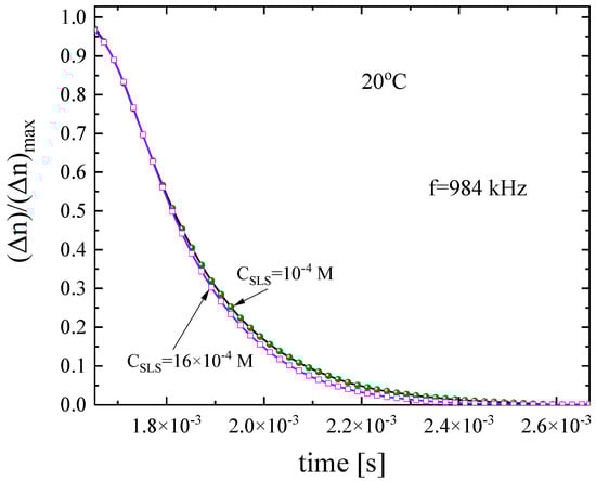 In Figure 3, two representative examples of the fitting procedure using Equation (4) corresponding to the decay region of the birefringence signal are shown. Pure liquids and mixtures composed of small molecules usually represent a relatively fast response [17]. Nevertheless, in the system studied in this work, the self-organization of SLS and the formation of larger supramolecular aggregates of the SLS@ASPH lead to a more perplexed structure, and the underlying dynamics are slower. The disorientation process through re-orientational diffusion is strongly affected by dipole–induced dipole interactions (DID interactions) between neighboring complex structural entities, and the timescale of the involved dynamics falls within the timescale of the ultrasonically induced birefringence technique.