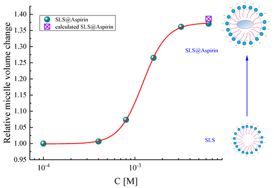 The hydrodynamic volume was estimated by applying the so-called Stokes–Einstein equation (Equation (5)), and the results were compared with the theoretically estimated volume and clearly indicated the incorporation of ASPH in the parental micelle. Subsequently, from the obtained hydrodynamic volumes, we estimated the relative volume change as a function of SLS concentration, and the results are presented in Figure 4. Figure 4 also shows the theoretically predicted volume change obtained from the initial volume of the SLS micelle and the final volume of the complex SLS@ASPH micelle. For the SLS micelle, we estimated the corresponding volume considering the micelle to be spherical with a radius equal to the size of the optimized one-dimensional structure of SLS. The volume of the SLS@ASPH micelle was estimated by considering the complex micelle to be an oblate spheroid. The major and the minor diameters of the aspirin, which was also considered to be a spheroid, were calculated following standard structure optimizing procedures in a vacuum environment without any interactions with the surroundings. Thus, the major diameter of the obtained SLS@ASPH micelle was considered the sum of two times the size of the SLS plus the major axis of the aspirin, while the minor diameter was estimated as the sum of two times the size of the SLS plus the minor axis of the aspirin.