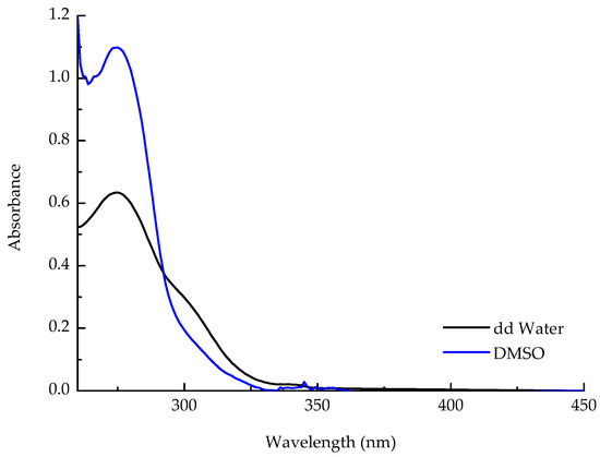 UV spectrum of SLS@ASPH in double distilled water (ddH2O) and in DMSO (1.2 mg/mL).
