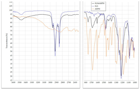 Vibrational spectroscopy is a powerful tool in the investigation of structural changes at the molecular level in the short-range order. The ATR-FT-IR spectra of SLS@ASPH, ASPH, and SLS presented in Figure 7 further support the proposed structural model. In order to clarify whether the final product SLS@ASPH micelle is not composite material, the linear combination of the SLS and ASPH vibrational spectra was determined to be identical to the recorded spectrum of the SLS@ASPH.