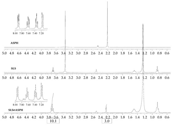 Nuclear magnetic resonance (1H-NMR) spectroscopy: The 1H NMR spectra of SLS@ASPH and of ligands were recorded (Figure 10). The resonance signals of the (H[-CH2α’-SO3-]) group of SLS at 3.70–3.66 ppm are slightly shifted in the spectrum of SLS@ASPH (3.79–3.69 ppm) [12,20]. The multiple resonance signals at 0.88–0.84 ppm in the spectrum of SLS are assigned to the protons of the [(-CH3)ω’] group of the SLS. The signals at 1.25 ppm and 1.50–1.47 ppm are attributed to the [(-CH2-)10] protons of SLS. The above signals were observed in the same frequency in the spectrum of SLS@ASPH (Figure 10).