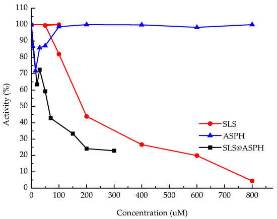 The influence of SLS@ASPH and its ingredients (SLS and ASPH) on the oxidation of linoleic acid by 15-LOX was studied by UV spectroscopy. The degree of LOX activity (A, %) was determined [24]. Figure 11 compares the inhibitory effect of SLS@ASPH and its ingredients. The IC50 values of the agents towards LOX activity are 74.8 μΜ (in respect to the ASPH) for SLS@ASPH and 237 μΜ in the case of SLS, while ASPH is a non-LOX inhibitor [25]. Furthermore, ASPH showed no inhibitory activity up to the tested concentration of 800 μΜ (Figure 11). For this case, a DMSO solution of ASPH was used due to the low solubility of ASPH in water. Furthermore, to the best of our knowledge, the SLS inhibitory activity towards LOX is reported here for the first time.