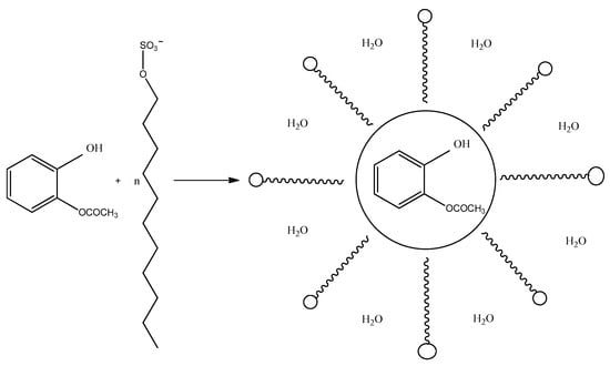 In the course of our studies towards the development of drug delivery systems [10,11,12,13], the water-soluble micelle SLS@ASPH (ASPH = aspirin, SLS = Sodium Lauryl Sulfate (Scheme 1)) was formed and characterized by m.p., FT-IR-ATR, XRF, UV-Vis, and 1H NMR spectroscopies. Moreover, the CMC was determined by ultrasonic velocity, complementary, and transient birefringence measurements. The inhibitory activity of SLS@ASPH towards lipoxygenase (LOX) was studied. The in vitro toxicity of SLS@ASPH was tested against HaCaT cells. The SLS was chosen for the solubilization of ASPH since (i) it is used for drug delivery [10,11,12,13], (ii) SLS is used as an anionic body detergent and cleanser ingredient (in shower gels and toothpastes) without any harmful irritation [14], and (iii) the U.S. Food and Drug Administration (USFDA) recognizes it as a harmless food ingredient (21 CFR 172,822).