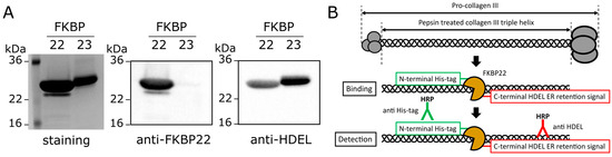 FKBP22 binding to collagens was determined by direct protein–protein binding measurements with surface plasmon resonance (SPR) using un-tagged FKBP22 [26]. In contrast, for FKBP22 binding to the collagen Toolkits, we used an ELISA-like assay that requires indirect detection by antibody and commonly uses the biochemical tags V5, CaM and 6xHistidine (His-) for detection. We first tested if a carboxyl terminal ER retention signal HDEL might be suitable for detection [31]. We expressed and purified recombinant human FKBP22 with an amino terminal His-tag (His-FKBP22) to validate the detection using HRP-conjugated antibodies against His-tag and HDEL in the ELISA-like binding assay. We confirmed by western blotting that this antibody recognized an HDEL sequence in both FKBP22 and FKBP23, which similarly has a carboxyl terminal HDEL ER retention signal [32,33] (Figure 1A and Figure S1).