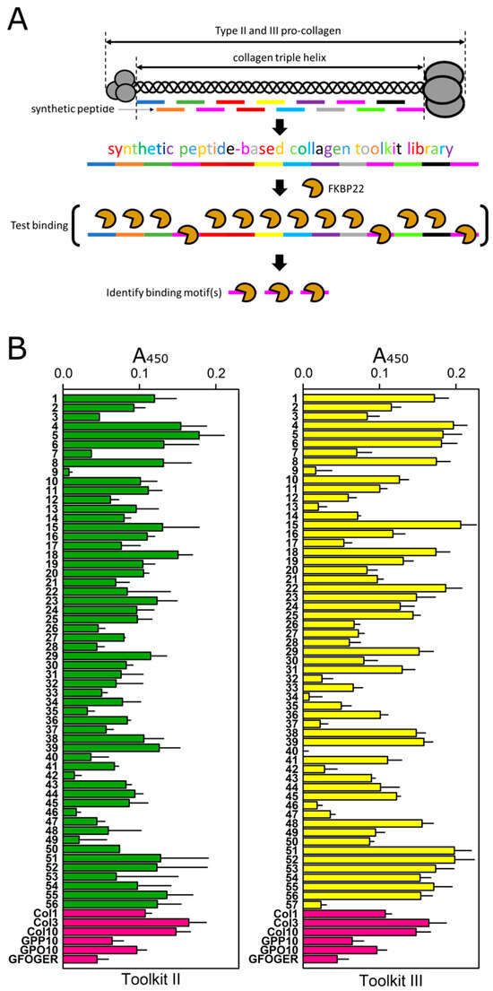 Identification of the FKBP22 binding motif(s) on collagen triple helices. (A) Diagram representing the strategy used to identify the FKBP22 binding motif(s) on collagen triple helices. (B) ELISA-like binding assays to identify the peptides recognized by recombinant FKBP22 (25 µM) using the collagen II and III synthetic peptide Toolkits. The green and yellow bars show binding to Toolkit II and III (coated with 1.0 µg/well to 96 well plates), respectively. The magenta bars show control peptides coated to 96 well plates: GPP10, GPO10 and integrin-binding peptide GFOGER (1.0 µg/well). Collagen I (Col1: 5.0 µg/well) was used as a negative control, and collagens III (Col3: 5.0 µg/well) and X (Col10: 2.0 µg/well) were used as positive controls. Signals are reported as absorbance at 450 nm (A450). In each assay, the five lowest signals were averaged and used as the baseline to be subtracted from other signals. Values in the graphs are presented as means ± S.E. The number of biological replicates was n = 3 for each Toolkit.