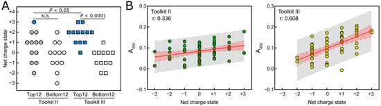 We predicted that we would identify a specific FKBP22 binding sequence from Toolkit III, as has been previously demonstrated for von Willebrand factor, matrix metalloproteinases, integrins, and small leucine-rich repeat proteoglycans using the same methods [30]. However, this binding activity was widespread and more similar in this respect to that observed for a collagen-binding bacterial adhesin, YadA [34]. The binding profile of YadA to Toolkit II resembled that of Toolkit III [34], while the binding profile of FKBP22 differed between Toolkits II and III (Figure 3B). This suggests that FKBP22 recognizes collagen peptides using some set of rules. Here, we propose a role for the net charge state of each Toolkit peptide, which is calculated by the sum of the positively charged amino acids, Arginine (R) and Lysine (K), and the negatively charged amino acids, aspartate (D) and glutamate (E) (Figure 3A,B). Interestingly, we found that most of the higher-affinity FKBP22-binding peptides in both Toolkits II and III carried a positive net charge (Figure 3B). Therefore, we compared the charge of the 12 highest and 12 lowest FKBP22-binding peptides within each Toolkit using the non-parametric Mann–Whitney test. This revealed a significant difference between the two groups (p < 0.0001) for Toolkit III but not Toolkit II, suggesting that the net charge state contributes to the binding of FKBP22 to Toolkit III peptides (Figure 4A). Moreover, simple linear regression analysis showed that overall FKBP22 binding capability was more strongly correlated with the net charge of the collagen peptides in Toolkit III than in Toolkit II (Figure 4B). Some peptides were found to be anomalous: TK-III-1 (Toolkit III peptide 1), for example, had a high affinity for FKB22 but was uncharged (Figure 3A,B), suggesting that other interactions may also be important. Taken together, although it is not sufficient to explain the entire mechanism of FKBP22 binding to specific collagen types, charge clearly plays an important role in this binding.