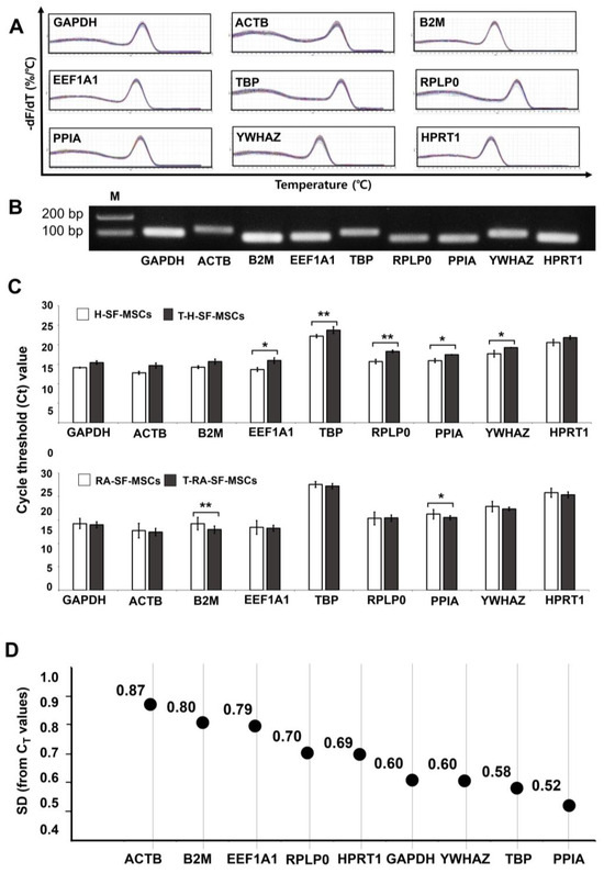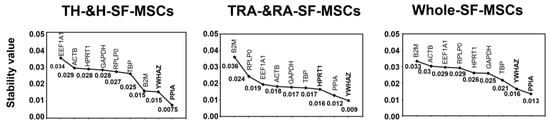 - Jeon, R.H.; Lee, W.J.; Son, Y.B.; Bharti, D.; Shivakumar, S.B.; Lee, S.L.; Rho, G.J. PPIA, HPRT1, and YWHAZ genes are suitable for normalization of mRNA expression in long-term expanded human mesenchymal stem cells. BioMed Res. Int. 2019, 2019, 3093545. [Google Scholar] [CrossRef]