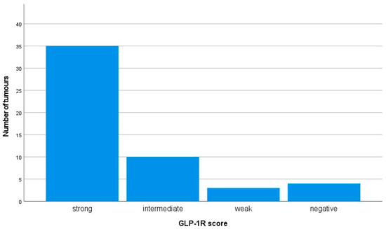 The lack of GLP-1R expression was associated with a larger tumour diameter and a higher Ki-67 PI. The median diameter of GLP-1R-negative tumours was significantly larger, 38 (range 15–60) mm, compared to 14 (range 5–40) mm in GLP-1R-positive tumours, p = 0.004. The median Ki-67 PI of GLP-1R-negative vs. positive tumours was 1.8% (range 0.4–16.1) vs. 0.4% (range 0.1–4.6), respectively, p = 0.022.