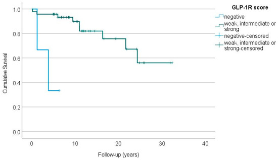 The lack of GLP-1R expression was associated with a significantly impaired overall survival in patients with sporadic insulinomas (Figure 2). Two of the three patients with metastatic, GLP-1R-negative insulinomas died 1 and 4 years after the primary surgery, while the third patient was alive at the end of the follow-up (over 6 years after the surgery). The GLP-1R-negative, MEN1-related insulinoma did not metastasize during the follow-up of over 20 years.