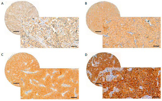 Evaluating and scoring of the GLP-1R staining. GLP-1R membranous score 0 (A), 1 (B), 2 (C) and 3 (D). Images were obtained from digitised slides with CaseViewer (3D HISTECH, Budapest, Hungary) software: whole TMA spots with magnification 8× (scale bar 200 µm), inset images with magnification 40× (scale bar 50 µm).