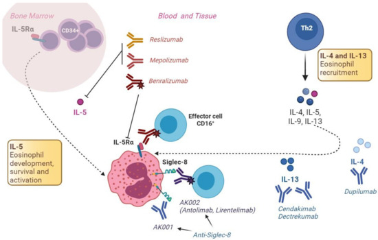 - Dellon, E.S.; Peterson, K.A.; Murray, J.A.; Falk, G.W.; Gonsalves, N.; Chehade, M.; Genta, R.M.; Leung, J.; Khoury, P.; Klion, A.D.; et al. Anti-Siglec-8 Antibody for Eosinophilic Gastritis and Duodenitis. N. Engl. J. Med. 2020, 383, 1624–1634. [Google Scholar] [CrossRef]