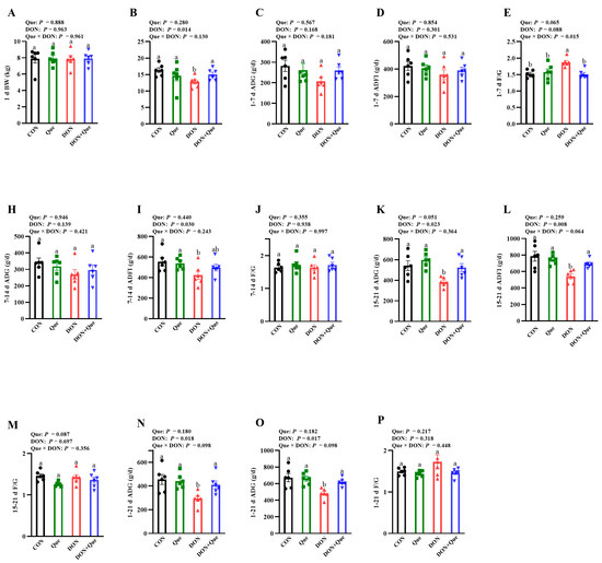 Throughout the 21-d trial, piglets fed with DON had a lower final body weight (BW) (p < 0.05), average daily gain (ADG) (p < 0.05), and average daily feed intake (ADFI) (p < 0.05) (Figure 1A–P). Que × DON interaction was observed for the feed: gain ratio (F/G) (p < 0.05) in days 1–7, in which Que supplementation was associated with a trend of decreasing the F/G in piglets fed with DON; however, there was no difference in non-DON fed piglets. Piglets fed with DON also had a lower ADFI (p < 0.05) on days 8–14, ADG (p < 0.05) and ADFI (p < 0.05) on days 15–21. However, piglets fed Que tended to have a higher ADG (p = 0.051) and lower F/G (p = 0.087) on days 15–21.