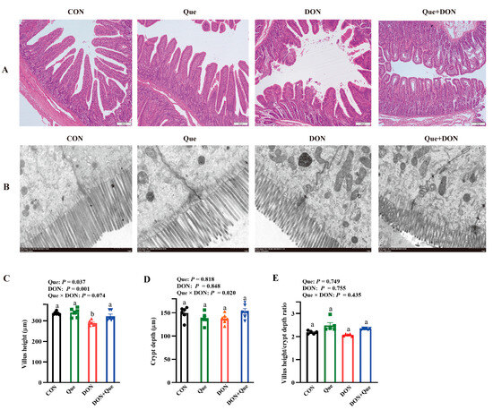 Compared to the control group, DON exposure led to intestinal morphologic damage demonstrated as the lifting of the epithelium at the tip of the villus, villous atrophy, and hemorrhage in the lamina propria (Figure 2A). However, Que supplementation rescued these intestinal morphologic changes after DON exposure. Furthermore, DON exposure also caused intestinal ultrastructure injury including intercellular space enlargement, endoplasmic reticulum expansion, mitochondria swelling, and cristae disappearance as well as nuclear deformation and nuclear membrane rupture compared with the control group (Figure 2B); however, dietary Que attenuated the ultrastructure injury after DON exposure in the piglets. The piglets exposed to DON had a lower villus height (p = 0.001) than the non-DON-fed piglets (Figure 2C,D). Compared to the piglets fed the basal diet, pigs fed with Que have a higher jejunal villus height (p < 0.05). A Que × DON interaction was observed for the villus height (p < 0.1). Que supplementation increased the villus height in the piglets fed with DON, whereas there was no effect among the non-DON-fed piglets. However, neither DON nor Que affected the villus height/crypt depth.