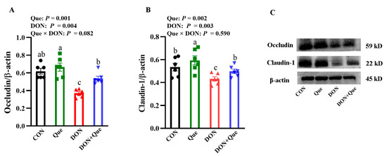 The piglets fed with DON had a lower claudin-1 and occludin (p < 0.05) protein expression than the non-DON-fed piglets (Figure 3). A Que × DON interaction was observed for occludin, in which Que supplementation increased the occludin protein expression in the piglets exposed with DON, whereas no difference was found for occludin among the non-DON-fed piglets. No Que × DON interaction was observed for claudin-1, in which Que supplementation increased the claudin-1 protein expression both in the DON-exposed piglets and the non-DON-fed piglets.