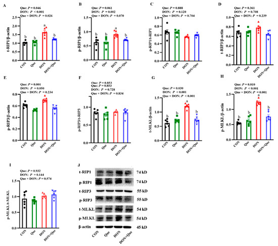 Piglets fed with DON had a higher total receptor interacting protein 1 (t-RIP1), phosphorylated receptor interacting protein 1 (p-RIP1), total receptor interacting protein 3 (p-RIP3), total mixed-lineage kinase domain-like protein (t-MLKL), and phosphorylated mixed-lineage kinase domain-like protein (p-MLKL) protein expression (p < 0.05) than the non-DON-fed piglets (Figure 4). Que × DON interactions were observed for t-RIP1, p-RIP1, phosphorylated receptor interacting protein 3 (p-RIP3), t-MLKL, and p-MLKL protein expression in which Que supplementation decreased the t-RIP1, p-RIP1, p-RIP3, t-MLKL, and p-MLKL protein expression in piglets fed with DON, whereas no difference was found for the t-RIP1 and t-MLKL protein abundance among the non-DON-fed piglets. However, neither DON nor Que affected the t-RIP3 protein abundance and the ratios of p-RIP1/t-RIP1, p-RIP3/t-RIP3, and p-MLKL/t-MLKL.