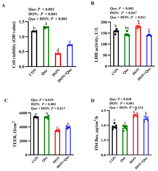 Effects of Que on cell injury and barrier integrity in IPEC-1 cell after DON challenge. Cells were pretreated with 10 µmol/L Que for 24 h and then challenged with or without 0.5 μg/mL DON for 2 h. (A) Cell viability. (B) LDH activity. (C) TEER. (D) FD4 permeability Values are means ± SE, n = 6. a–d Different letters represent a significant difference. Differences were considered significant for values of p ≤ 0.05. LDH, lactate dehydrogenases; FD4, fluorescein isothiocyanate (FITC)-labeled dextran 4 kDa; TEER, transepithelial electrical resistance; IPEC-1, intestinal porcine epithelial cell 1.