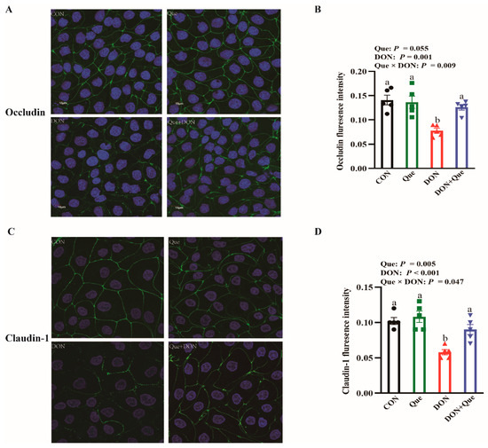 The DON challenge disrupted the distribution of the tight junction proteins occludin and claudin-1 (Figure 6). The cells treated with DON had a lower claudin-1 and occludin fluorescence intensity (p < 0.05) than the non-DON-treated cells. Que × DON interactions were observed for the claudin-1 and occludin fluorescence intensity in which Que supplementation increased the claudin-1 and occludin fluorescence intensity in IPEC-1 cells treated with DON; however, no difference was found for the claudin-1 and occludin fluorescence intensity among the non-DON-treated cells.