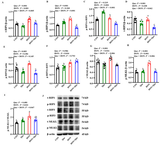 Effects of Que on protein expression of necroptosis signals in IPEC-1 cells after DON challenge. Cells were pre-treated with 10 µmol/L Que for 24 h and then challenged with or without 0.5 μg/mL DON for 2 h. (A–I) t-RIP1, t-RIP3, t-MLKL, p-RIP1/t-RIP1, p-RIP3/t-RIP3 protein expression, and ratio of p-MLKL/t-MLKL. (J) Representative bands. Values are means ± SE, n = 6. a–d Different letters represent a significant difference. Differences were considered significant for values of p ≤ 0.05. IPEC-1, intestinal porcine epithelial cell 1; t-RIP1, total receptor interacting protein 1; p-RIP1, phosphorylated receptor interacting protein 1; t-RIP3, total receptor interacting protein 3; p-RIP3, phosphorylated receptor interacting protein 3; t-MLKL, total mixed-lineage kinase domain-like protein; p-MLKL, phosphorylated mixed-lineage kinase domain-like protein.