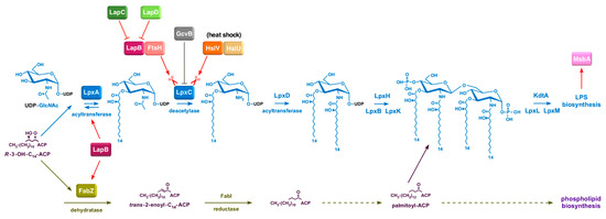 - Klein, G.; Wieczorek, A.; Szuster, M.; Raina, S. Checkpoints that regulate balanced biosynthesis of lipopolysaccharide and its essentiality in Escherichia coli. Int. J. Mol. Sci. 2021, 23, 189. [Google Scholar] [CrossRef]