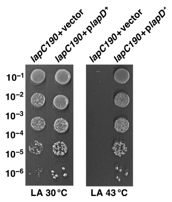 4.2. Identification of Multicopy Suppressors Whose Overexpression Suppresses the Temperature-Sensitive Phenotype of lapC190 Bacteria