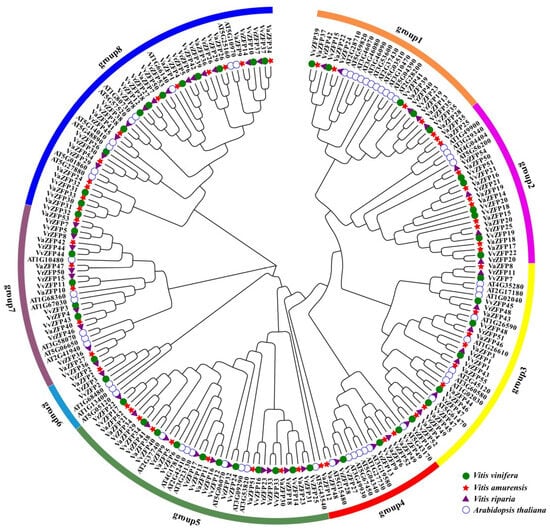 The identified 52 Q-type VvZFP, 54 Q-type VrZFP, 55 Q-type VaZFP, and 57 Q-type AtZFP proteins were obtained from the Phytozome, VITSGDB, NCBI, and TAIR databases, respectively. Multiple sequence alignment of the 218 ZFP proteins was performed using the software MEGA7.0 [28]. According to the distance of their kinship, the 218 ZFP proteins were divided into eight groups (Figure 1). Group 1 comprised 5 VvZFP, 5 VrZFP, 5 VaZFP, and 11 AtZFP proteins. Group 2 comprised 6 VvZFP, 4 VrZFP, 10 VaZFP, and 4 AtZFP proteins. Group 3 comprised 7 VvZFP, 8 VaZFP, 8 VrZFP, and 9 AtZFP genes. Group 4 comprised 3 VvZFP, 4 VaZFP, 3 VrZFP, and 7 AtZFP proteins. Group 5 comprised 10 VvZFP, 9 VaZFP, 10 VrZFP, and 8 AtZFP proteins. Group 6 comprised 10 VvZFP, 9 VaZFP, 10 VrZFP, and 8 AtZFP genes. Group 7 comprised 6 VvZFP, 6 VaZFP, 8 VrZFP, and 6 AtZFP proteins. Group 8 comprised 12 VvZFP, 11 VaZFP, 11 VrZFP, and 9 AtZFP proteins.