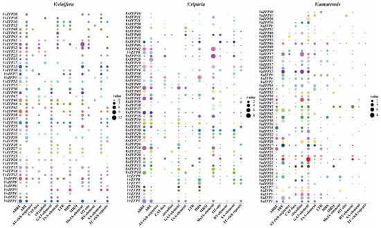 Distribution of major stress- and hormone response-related cis-acting regulatory elements in the promoters of VvZFP, VrZFP, and VaZFP genes. Note: Different colors represent different genes, the location of the circle corresponds to the corresponding cis-acting element, and the size of the circle represents the number of corresponding cis-elements.
