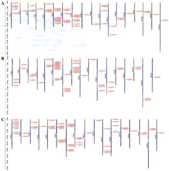 Chromosomal distributions of ZFP family genes in Vitis vinifera, Vitis amurensis, and Vitis riparia. Note: The physical positions of ZFP were mapped according to the grape genome, the left scale for the chromosomal length is mega bases (Mb), and the chromosome number is shown at the right of each chromosome. The color on the chromosome indicates the density of genes, with red indicating the highest density and blue indicating the lowest density. (A) Chromosome distribution of VvZFPs, (B) chromosome distribution of VaZFPs, (C) chromosome distribution of VrZFPs.