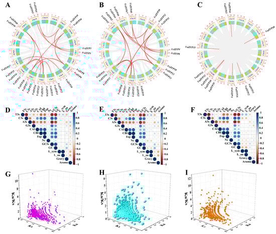Schematics for the chromosomal distribution, interchromosomal relationships, Ka/Ks, and codon usage bias analysis of ZFP genes in the three grape species genomes. Note: (A–C), Syntenic relationship of ZFP in V. vinifera, V. riparia, and V. amurensis, respectively, genes in gray lines indicate all synteny blocks in the grape genome, and the red lines indicate duplicated VvZFP, VrZFP, VaZFP gene pairs; the chromosome number is indicated at the bottom of each chromosome. (D–F), Codon usage indexes correlation analysis of VvZFPs, VrZFPs, and VaZFPs, respectively; blue represents positive correlation, red represents negative correlation, and white represents no correlation; the larger the circle and the darker the color, the stronger the correlation and vice versa; “T3s, C3s, A3s, G3s”: refer to the T, C, A, and G content of the third position of the synonymous codon, respectively; “CAI” refers to the codon adaptation index; “CBI” refers to the codon bias index; “FOP” refers to the frequency of optimal codons; “GC3s” refers to the amount of the third codon (G+C); “GC” refers to the count of genes (G+C). “GC3s” refers to the amount of the third codon; “Nc”: refers to the number of codon; “L_sym” refer to the degeneracy of Symmetry codon; “L_aa”: refers to the number of synonymous and non-synonymous codons; “Gravy”: refers to hydrophobicity of protein; “Aromo”: refers to aromaticity of protein. (G–I), the Ka/Ks analysis of VvZFPs, VrZFPs, and VaZFPs, respectively; purple represents Ka/Ks of VvZFPs, blue represents Ka/Ks of VrZFPs, orange represents Ka/Ks of VaZFPs.