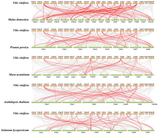 Synteny analysis of VvZFP genes of the five plant species. Note: Gray lines in the background indicate the collinear blocks within Arabidopsis thaliana and Vitis vinifera; Malus domestica and Vitis vinifera; Prunus persica and Vitis vinifera; Musa acuminata and Vitis vinifera; and Solanum lycopersicum and Vitis vinifera genomes, while the red lines highlight the syntenic VvZFP gene pairs among grape and other five plant species genomes.