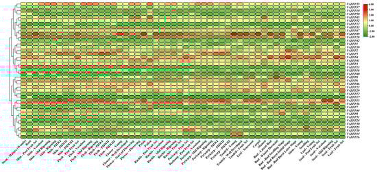 Hierarchical clustering of the expression profiles of 41 VvZFP genes in different tissues of grapevine at different growth and development stages. Note: Heatmaps were plotted using gene expression data of genechip microarrays, which were obtained from the GEO database on the NCBI website (NCBI accession number: GSE36128) [31]. The FPKM value was normalized to Log2 (FPKM+1) for data processing. Red and green shades represent the upregulated and downregulated expression levels, respectively. The scale denotes the relative expression level.