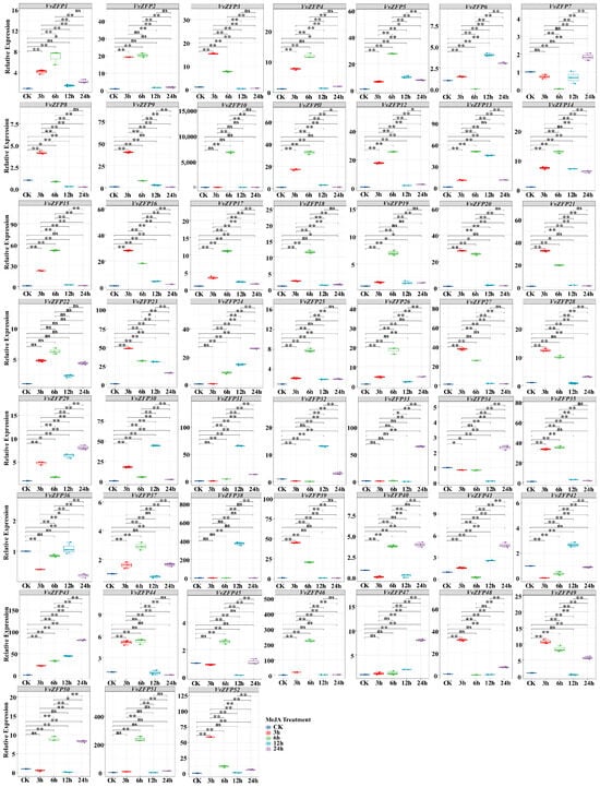 The expression of VvZFP genes under MeJA treatment. Note: The suspension cells samples were collected after 3 h, 6 h, 12 h and 24 h under 100 μM·L−1 MeJA. Untreated suspension cells at each time point were as control, respectively. The expression levels of VvZFPs were normalized with elongation factor-1α (EF-1α), and the relative expression was calculated using the 2−∆∆Ct method [32]. Error bars represent the standard deviation for three biological replicates. Statistical analysis was performed using SPSS version 26.0, with pairwise comparison using the LSD method (‘*’ represents p < 0.05; ‘**’ represents p < 0.01).