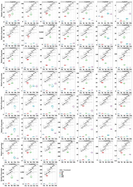 The expression of VvZFP genes under ABA treatment. Note: The suspension cells samples were collected after 3 h, 6 h, 12 h and 24 h under 100 μM·L−1 ABA. Untreated suspension cells at each time point were as control, respectively. The expression levels of VvZFPs were normalized with elongation factor-1α (EF-1α), and the relative expression was calculated using the 2−∆∆Ct method [32]. Error bars represent the standard deviation for three biological replicates. Statistical analysis was performed using SPSS version 26.0, with pairwise comparison using the LSD method (‘*’ represents p < 0.05; ‘**’ represents p < 0.01).