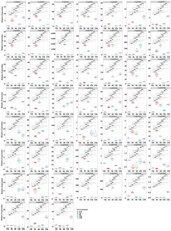 After treatment with 200 μmol·L−1 SA, the results of qRT-PCR revealed the expression of 8 VvZFPs was upregulated consistently across all time points (p < 0.05), only VvZFP49 manifested a significant downregulation throughout the experiment (p < 0.05) (Figure 10). For 3 h, the remarkably upregulated genes were VvZFP1-VvZFP6, VvZFP8, VvZFP9, VvZFP11, VvZFP12, VvZFP14-VvZFP17, VvZFP20-VvZFP23, VvZFP25-VvZFP28, VvZFP30, VvZFP33-VvZFP35, VvZFP37, VvZFP39, VvZFP44, VvZFP45, VvZFP48, and VvZFP51 (p < 0.01), of which 12 genes reached the peak of expression levels; furthermore, VvZFP11 and VvZFP39 had the highest relative expression levels of 76.89 and 80.53, respectively (Figure 10). With 200 μmol·L−1 SA treatment for 6 h, the upregulated genes were VvZFP2, VvZFP4, VvZFP5, VvZFP10-VvZFP28, VvZFP30, VvZFP33-VvZFP35, VvZFP37, VvZFP39, VvZFP40, VvZFP42, and VvZFP44-VvZFP47 (p < 0.01), of which 23 genes reached the peak of expression, and VvZFP10 had the highest relative expression level of 1870.33, followed by VvZFP13, VvZFP46, and VvZFP47, with the relative expression levels of 201.19, 143.23, and 234.68, respectively. With 200 μmol·L−1 SA treatment for 12 h, significantly upregulated expression genes were VvZFP13, VvZFP19, VvZFP24, VvZFP25, VvZFP29-VvZFP31, VvZFP37, VvZFP38, VvZFP42, and VvZFP43 (p < 0.01), among which VvZFP13 exhibited the highest relative expression level of 431.72, and VvZFP6, VvZFP30-VvZFP32, VvZFP38, and VvZFP42 achieved their expression peaks. With 200 μmol·L−1 SA treatment for 24 h, the remarkably upregulated genes were VvZFP1-VvZFP7, VvZFP16-VvZFP20, VvZFP22, VvZFP24-VvZFP26, VvZFP28, VvZFP29, VvZFP31, VvZFP37, VvZFP42, VvZFP43, VvZFP45, VvZFP48, and VvZFP50-VvZFP52, among which VvZFP24 exhibited the highest relative expression level of 21.47. These analyses indicated the expression of VvZFPs were induced by SA treatment, but with the differences in response speed and expression level.