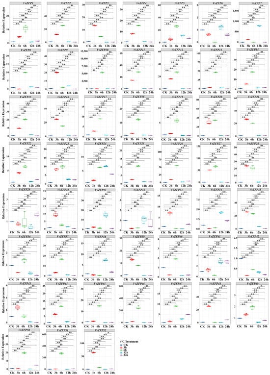 Under the treatment of 4 °C, 6 of 52 VvZFPs were observed to be significantly upregulated across all time points (p < 0.05). In contrast, VvZFP42 exhibited consistent downregulation throughout, while the expression level of VvZFP29 had no changes during the treatment of 4 °C. The genes upregulated significantly after 4 °C treatment were VvZFP1-VvZFP5, VvZFP7-VvZFP9, VvZFP11-VvZFP28, VvZFP30, VvZFP33, VvZFP35, VvZFP37, VvZFP39, VvZFP43, VvZFP44, VvZFP45, VvZFP47-VvZFP49, and VvZFP52 (p < 0.01), of which VvZFP27 and VvZFP52 showed the highest relative expression levels of 51.77 and 64.0, respectively (Figure 11), and 13 genes of them reached the expression peak. After 6 h of treatment at 4 °C, the remarkably upregulated genes were VvZFP1-VvZFP5, VvZFP8-VvZFP28, VvZFP35-VvZFP37, VvZFP39, VvZFP40, VvZFP44-VvZFP47, VvZFP49, VvZFP50-VvZFP52 (p < 0.01), of which VvZFP10 had the highest relative expression level of 5420.95, furthermore the expression levels of 29 upregulated genes peaked at 6 h. After 12 h of treatment at 4 °C, the genes with increased expression were VvZFP5, VvZFP6, VvZFP7, VvZFP14, VvZFP22-VvZFP24, VvZFP26, VvZFP33, VvZFP34, VvZFP38, VvZFP41, and VvZFP47 (p < 0.01), of which VvZFP6, VvZFP7, VvZFP24, VvZFP31, VvZFP34, VvZFP38, and VvZFP41 reached the peak expression, with VvZFP7 exhibiting the highest relative expression level of 789.01. After 24 h of treatment at 4 °C, the genes that were upregulated significantly included VvZFP5, VvZFP6, VvZFP22-VvZFP24, VvZFP29, VvZFP33, VvZFP34.