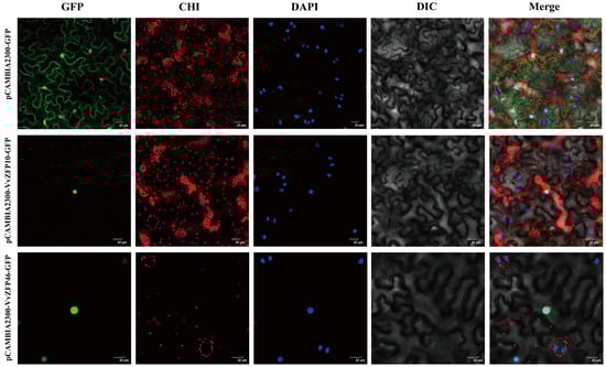 To determine the subcellular localization of the VvZFP10 and VvZFP46 proteins, Agrobacterium containing the recombinant plasmids pCAMBIA2300-VvZFP10-GFP and pCAMBIA2300-VvZFP46-GFP was injected into tobacco leaves for transient expression, with pCAMBIA2300-GFP as control. As depicted in Figure 12, VvZFP10 and VvZFP46 were localized in the nucleus of tobacco cells. Accordingly, we inferred that VvZFP10 and VvZFP46 are located in the nucleus.