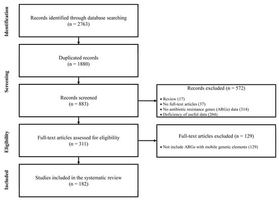 PRISMA (Preferred Reporting Items for Systematic Review and Meta-Analysis) flow diagram used for selection of studies regarding ARGs and their linkages to MGEs.
