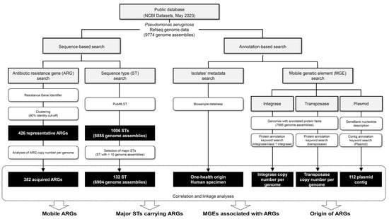 Flow diagram for a genome database survey for ARG, ST, MGE, and origin analyses.