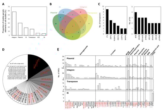 Characteristics and linkages of ARGs and MGEs identified by a systematic literature analysis. (A) Proportion of six types of MGEs; (B) Venn diagram indicating co-existence of MGEs [35]; (C) the number of types of transposons and ISs; (D) proportion of STs. Red letters indicate the top 10 high-risk clones; (E) the number of cases of ARGs observed in plasmids, integrons, transposons, and ISs. ARGs exhibiting the correlation with MGEs (more than three cases) are displayed. Red ARGs indicate mobile ARGs identified by a genome database survey (see the Figure in Section 3.2.4).