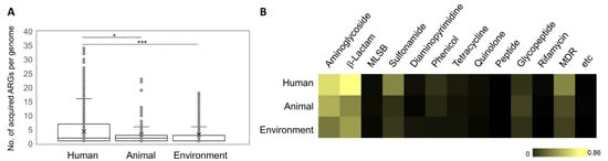 Abundance of acquired ARGs in One Health sectors. (A) the number of acquired ARGs in isolates from One Health sectors (*, p < 0.05; ***, p < 0.001); (B) heatmap displaying ARG abundance grouped into antibiotic classes in the One Health sector.