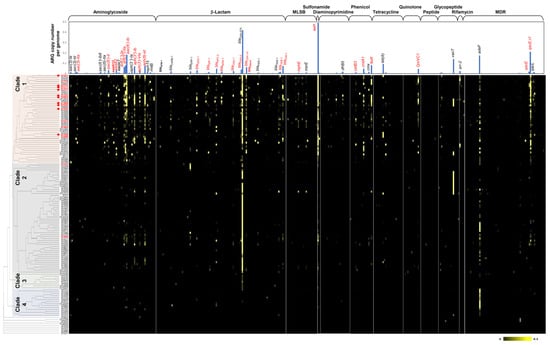 Abundance profiles of 382 acquired ARGs according to STs. The densities of the 382 acquired ARGs according to the STs are displayed as a heatmap. The overall density of each ARG in all genomes is indicated at the top as bar graphs. Left-axis clustering and distinct clades were obtained by the Bray–Curtis dissimilarity matrix of ARG repertoires of all genomes belonging to each ST. Red-colored ARG names indicate the coincidence of the prevalent ARGs in both systematic literature analysis and genome database survey. Major STs in the literature analysis are displayed in red (see Figure 3D) and the top 10 high-risk clones were marked with red arrows.