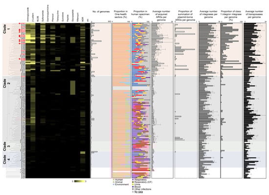 In Figure 6, ARG densities are grouped into corresponding antibiotic classes and compared to the isolate information (One Health origins) and the abundance of MGEs. The genomes of the isolates belonging to the STs of clade 1 were actively analyzed and reported in the genome database; most of them originated from humans. Further examination of the human specimen of isolates in clade 1 revealed that they were isolated from various infection sites including the respiratory tract (non-CF), whereas STs in clade 2 were predominantly isolated from the respiratory tract of patients with CF (Figure 6). These findings align with those of previous studies; thus, indicating a high frequency of hypermutable P. aeruginosa in CF lung infections where resistance is primarily caused by mutational resistance rather than the horizontal acquisition of ARGs [10,43]. The correlation between the density of acquired ARGs and the abundance of MGEs also suggested that STs in clade 1 were more actively involved in the dissemination of acquired ARGs than were those in the other clades. The proportion of plasmid-borne ARGs and the average copy numbers of integrases and transposases per genome were higher for STs in clade 1 (Figure 6). Remarkably, the proportion of class 1 integron integrases was distinctly higher in the STs in clade 1, and this coincided with the high frequency of sul1 and qacEΔ1 in these STs (Figure 6). Collectively, the distribution of acquired ARGs appears to be dependent upon STs. STs in clade 1 are involved in various human infections and are postulated to be the major carriers and dissemination routes of acquired ARG within this species.