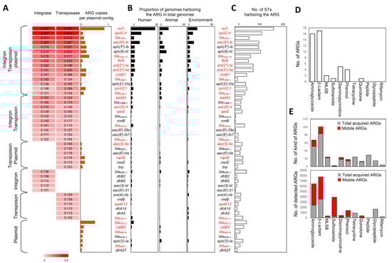 Mobile ARGs elucidated by MGE correlation and their significance. (A) ARGs exhibited associations with at least one MGE. ARGs exhibiting a statistically significant positive correlation (r > 0.1, p < 0.001) with integrase or transposase in Pearson correlation analysis were defined as mobile ARGs. For plasmids, ARG copy numbers per plasmid contig were used to define mobile ARGs; (B) One Health origin of mobile ARGs; (C) ST distribution of mobile ARGs; (D) types of mobile ARGs according to antibiotic class; (E) number and amount of mobile ARGs relative to those of acquired ARGs according to antibiotic class. Red ARGs indicate mobile ARGs identified by a literature analysis (see Figure 3E).