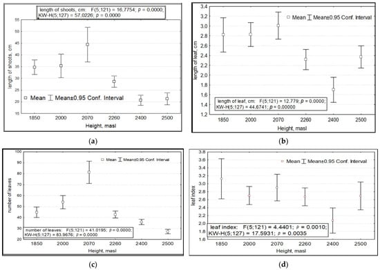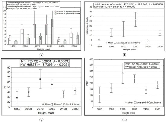 Variability of morphometric features of Rhodiola rosea at different absolute altitudes. Designations: (a) length of shoots; (b) length of leaves; (c) number of leaves; (d) leaf index: ratio of max to min size; (e) number of vegetative and generative shoots; (f) total number of shoots; (g) number of inflorescences with fruits; (h) potential seed productivity. On the X-axis—the values of features with a 95% confidence interval; along the Y axis—gradations of the factor.
