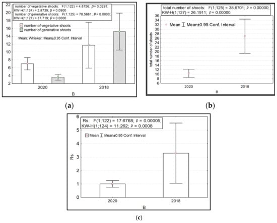 The variability in the number of generative and vegetative shoots and their total number and ratio depended significantly on the year of the study (factor B). Higher values of these parameters were recorded for R. rosea in 2018 (Figure 2).