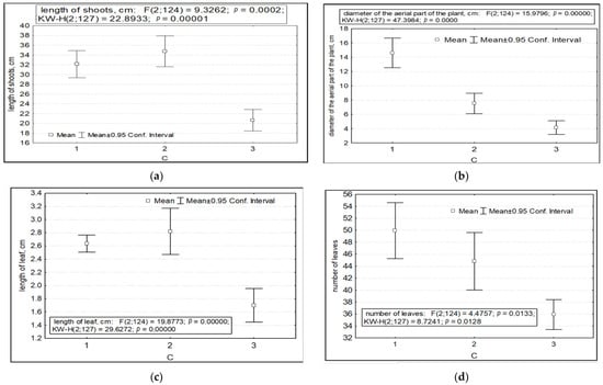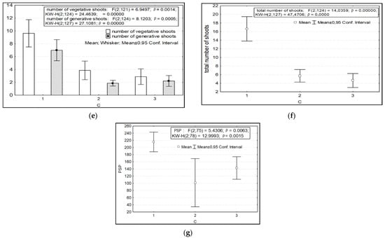 Variability of morphometric characteristics of Rhodiola rosea under different anthropogenic impacts (factor C). Designations: (a) length of shoots; (b) diameter of the aerial part of the plant; (c) length of leaves; (d) number of leaves; (e) number of vegetative and generative shoots; (f) total number of shoots; (g) potential seed productivity. On the X-axis—the values of features with a 95% confidence interval; along the Y axis—gradations of the factor.